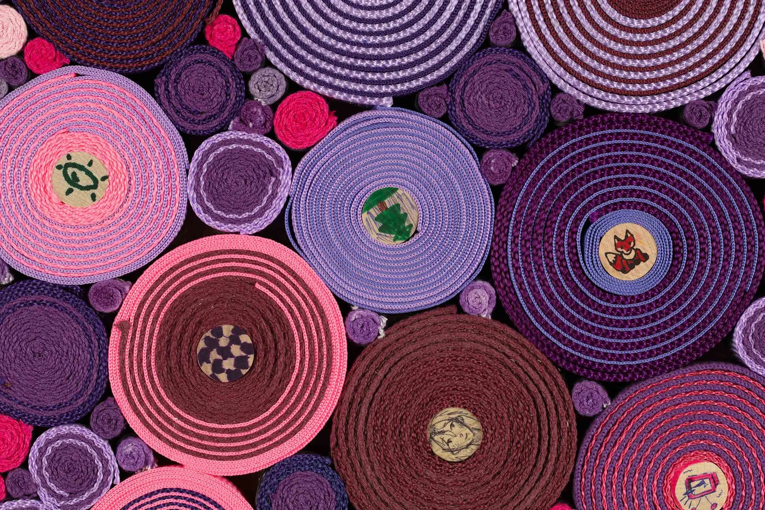 Jawbreaker, 2025. Collaborative Masterwork created with 112 participants at Central High School during the National Scrollathon in Wyoming. Fiber, rubber bands, pins, ink, glue, and wood. 48 × 36 × 1 in.
