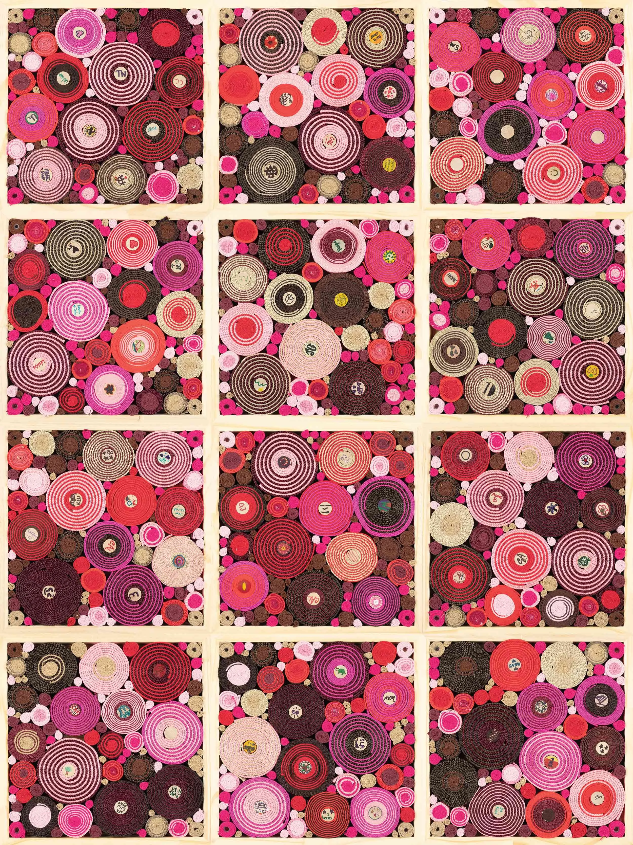 Finding My Roots, 2025. Collaborative Masterwork created with 95 participants at Dixon Gallery and Gardens during the National Scrollathon in Tennessee. Fiber, rubber bands, pins, ink, glue, wood and paint. 48 × 36 × 1 in.