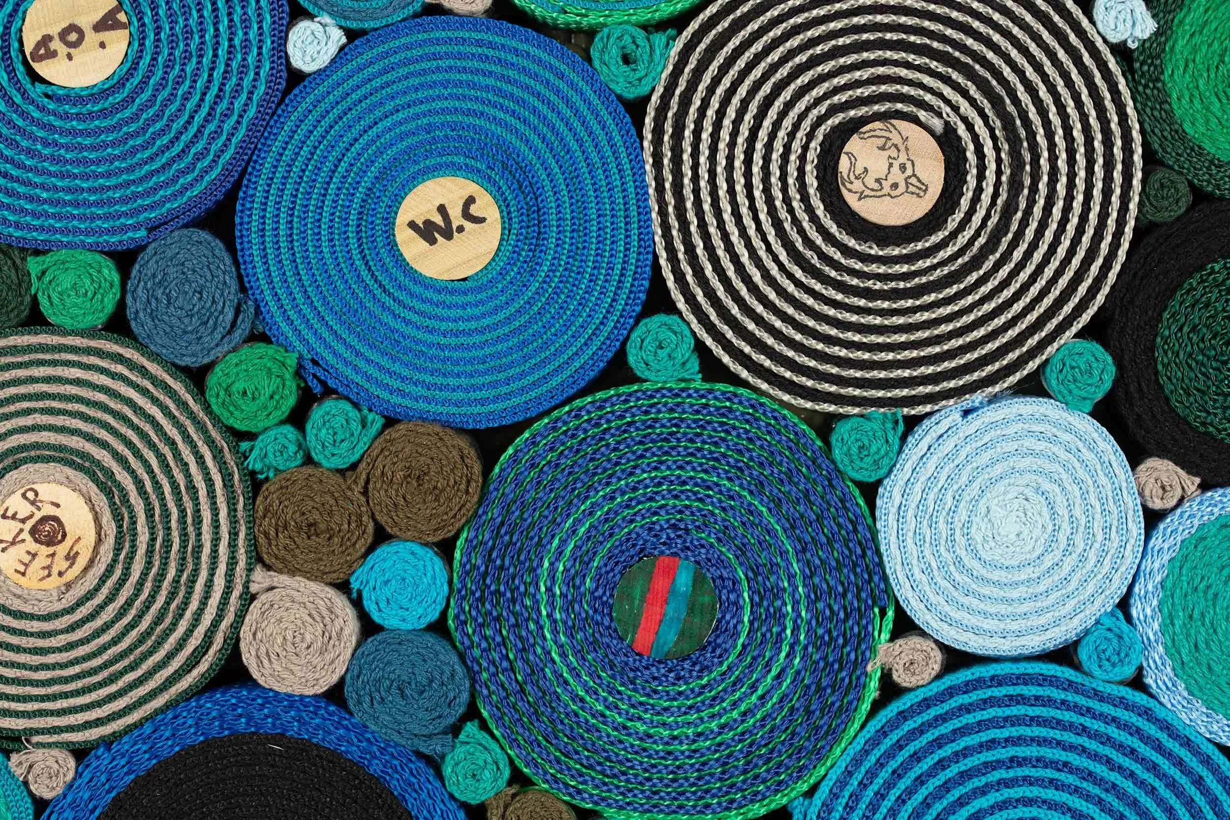Ember, 2025. Collaborative Masterwork created with 193 participants at the Joslyn Art Museum during the National Scrollathon in Nebraska. Fiber, rubber bands, pins, ink, glue, wood and paint. 60 × 72 × 1 in.