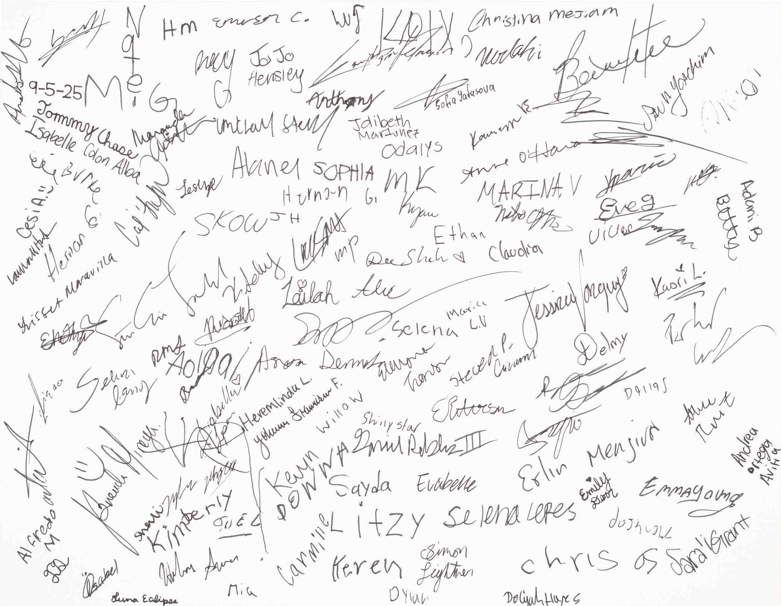 Signature Plate bearing the names of 193 participants of the National Scrollathon in Nebraska, 2025. Archival paper, ink, 8 1/2 x 11 in.