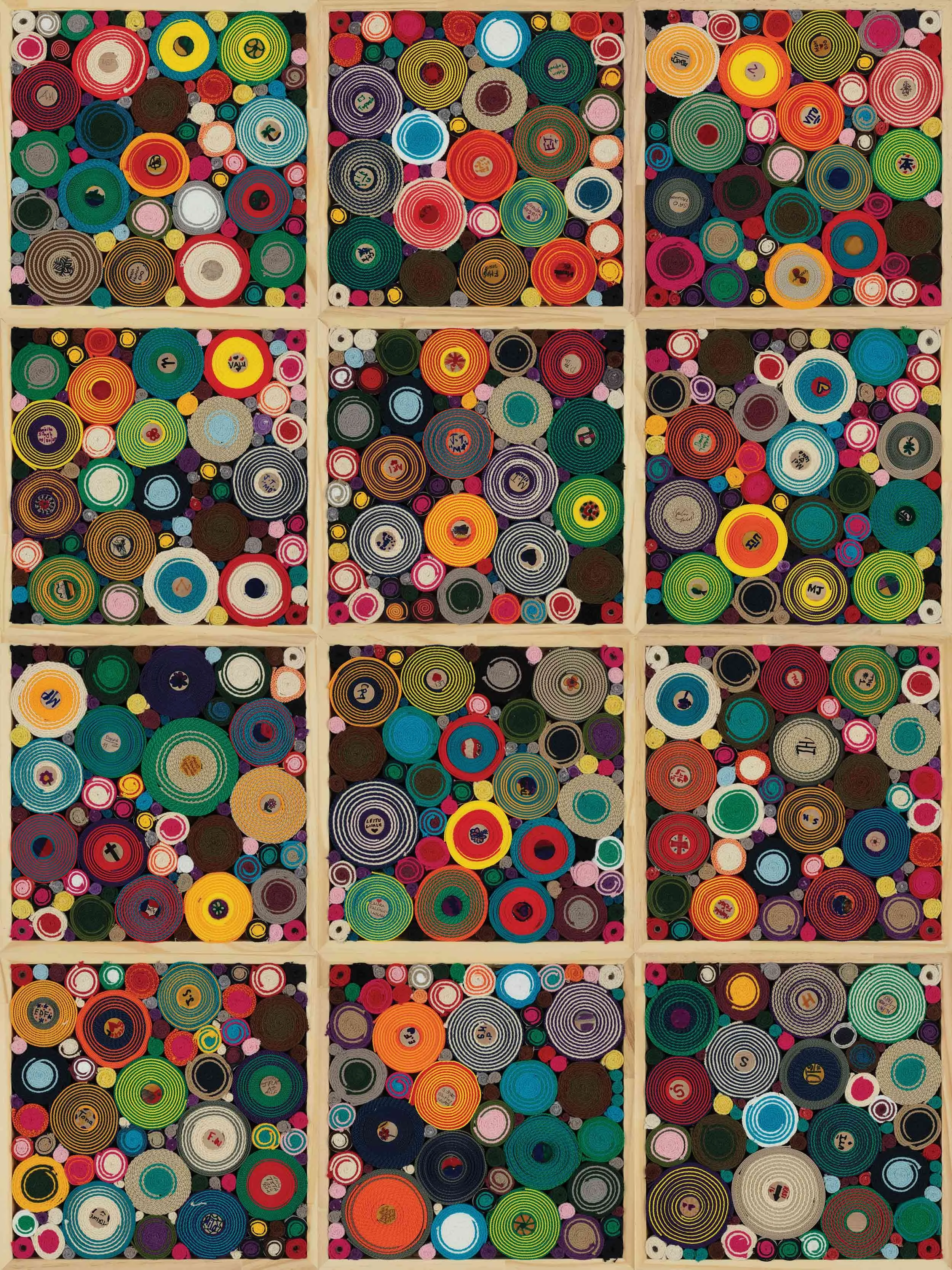 My Heritage, 2025. Collaborative Masterwork created with 107 participants at Marist Saint Francis Elementary - Mary the Mother Montessori Schools during the National Scrollathon in American Samoa. Fiber, rubber bands, pins, ink, glue, and wood. 48 × 36 × 1 in.
