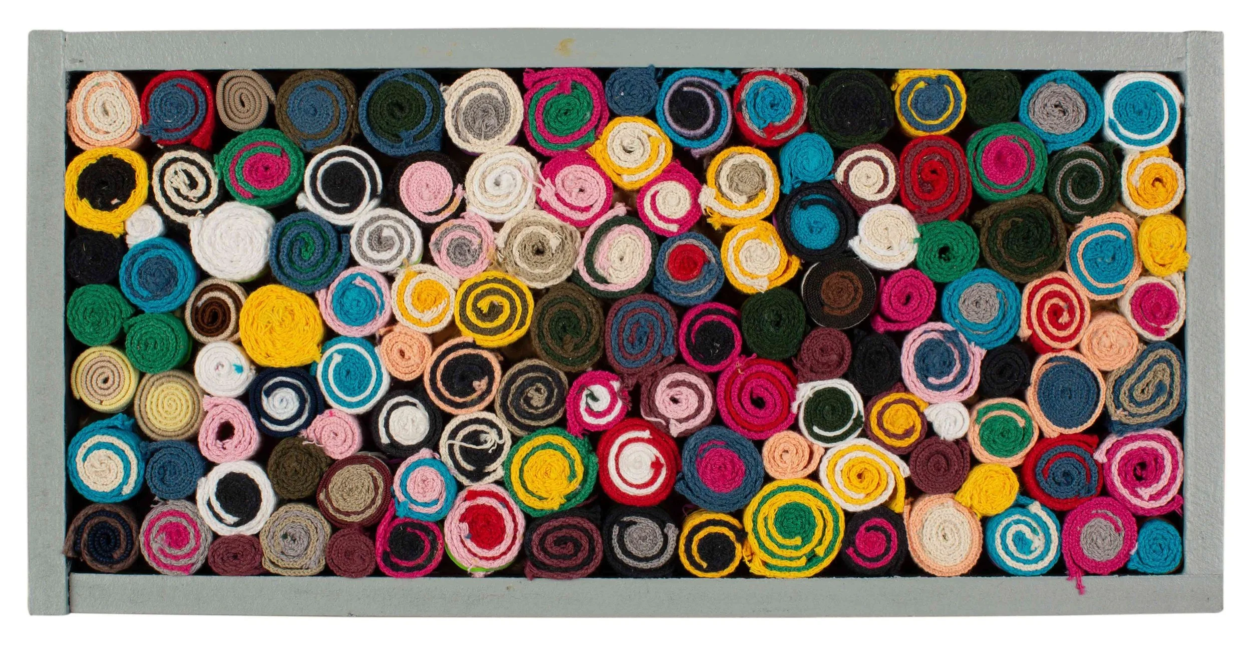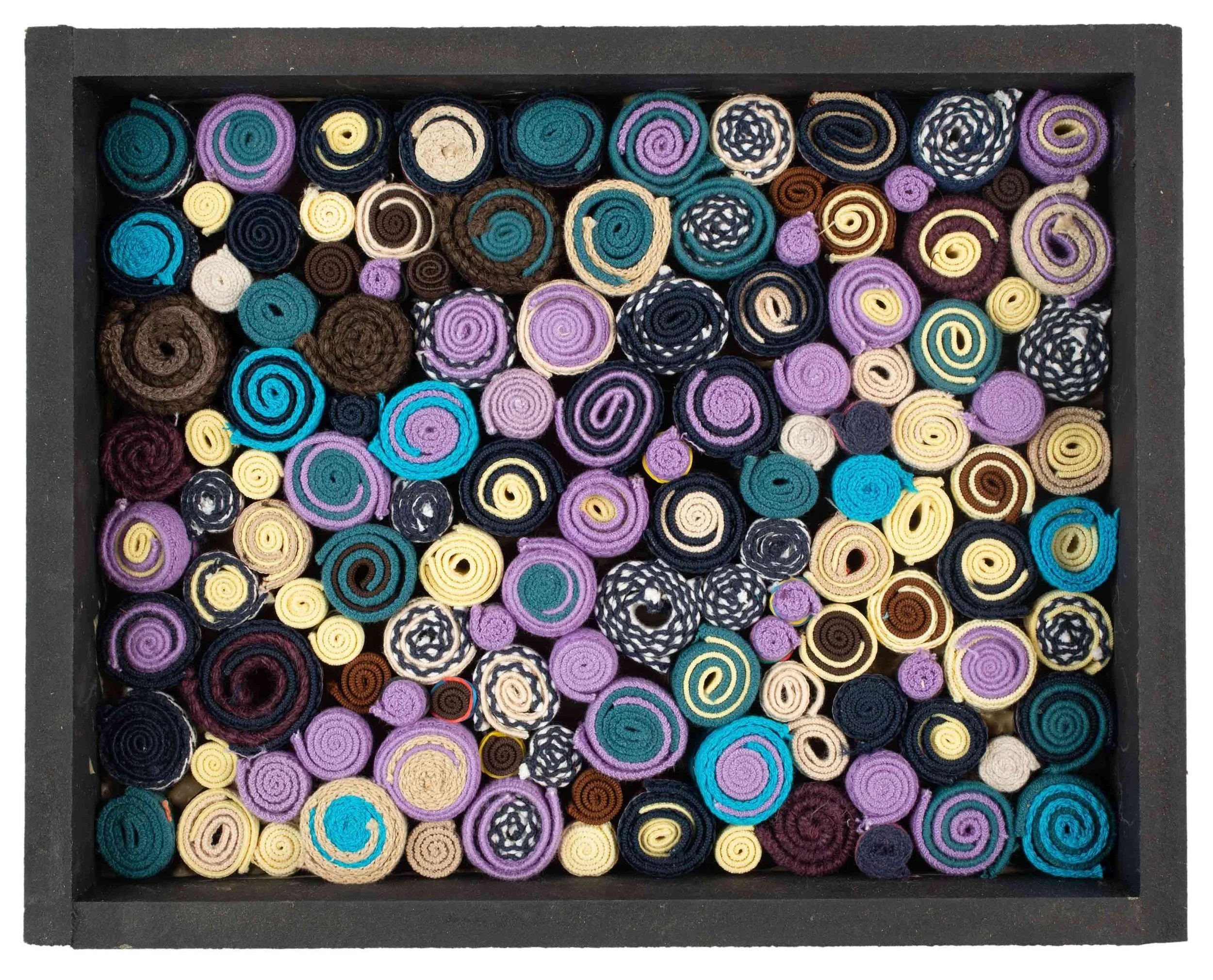 Rikers: Shades of Rosies, 2014, archival board, fiber, rubber- bands, 10 ¼ x 10 ¼ x 2 ⅝ inches
