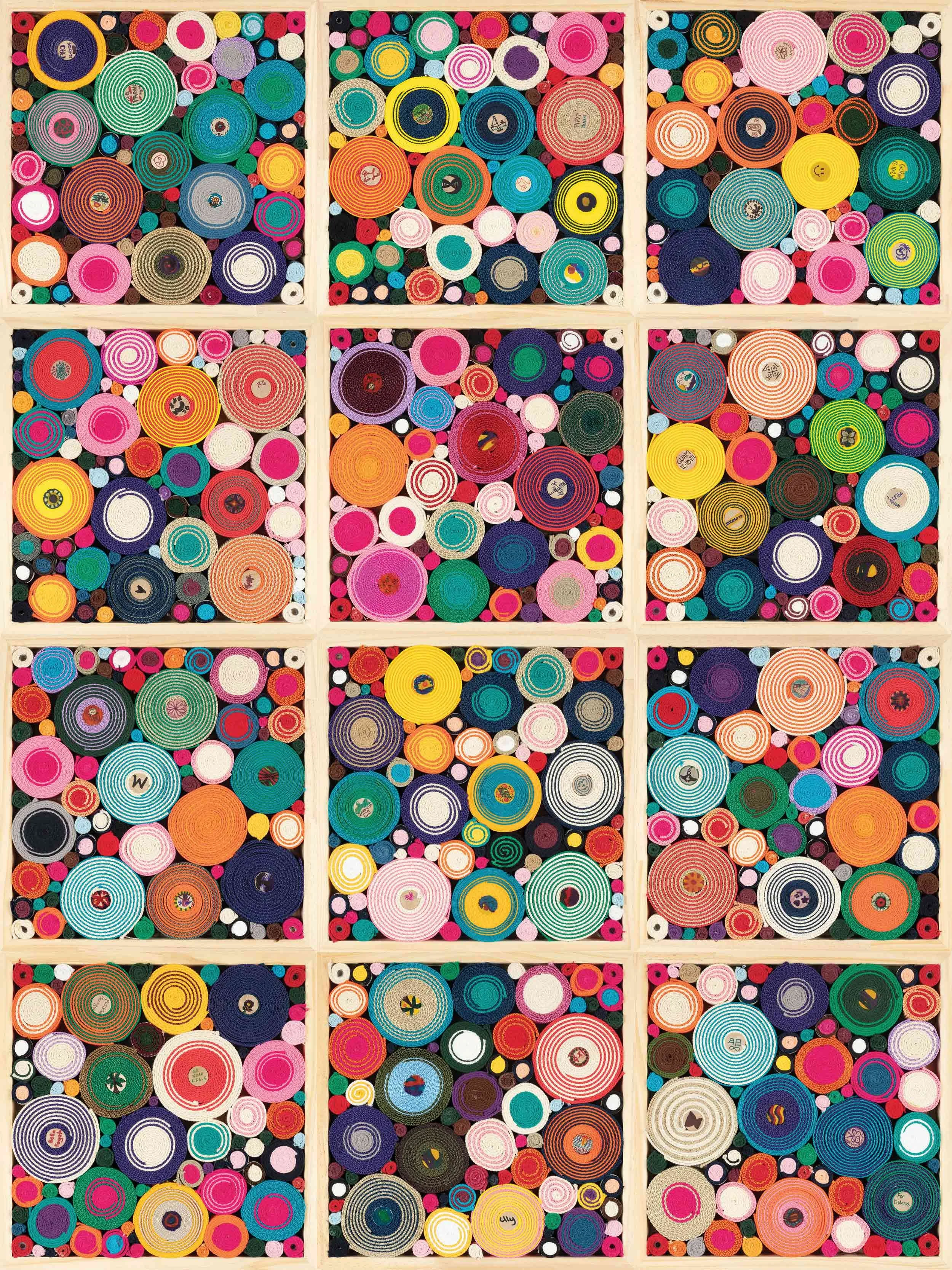 You and Me, Me and You, All of Us Together, 2022, fiber, rubber bands, pins, glue, wood, paint, approximately 96 x 96 x 3 1/2 inches