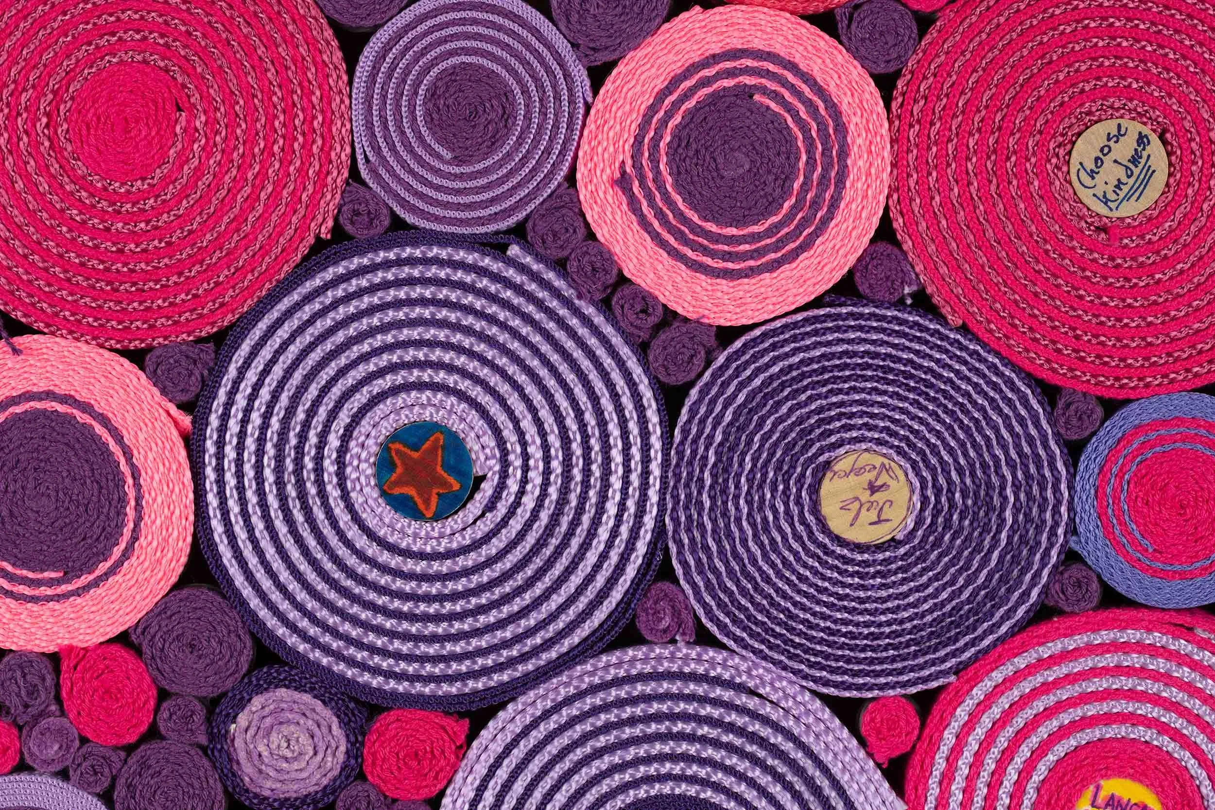 Resilience, 2026. Collaborative Masterwork created with 31 participants at Rising Sun High during the National Scrollathon in Maryland. Fiber, rubber bands, pins, ink, glue, and wood. 48 × 36 × 1 in.