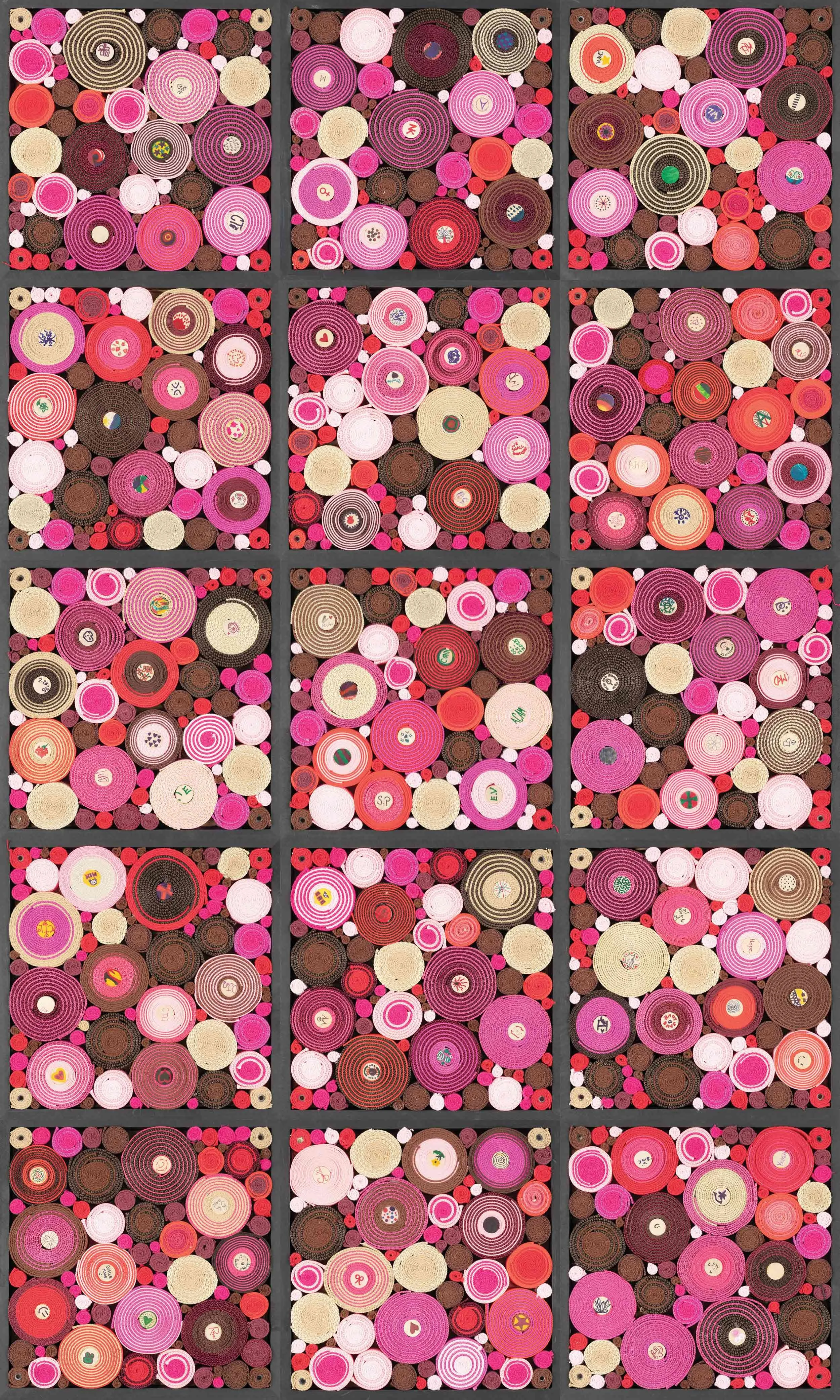 Growing Pains, 2025. Collaborative Masterwork created with 98 participants at The Aldrich Contemporary Art Museum during the National Scrollathon in Connecticut. Fiber, rubber bands, pins, ink, glue, wood, and paint. 60 × 36 × 1 in.