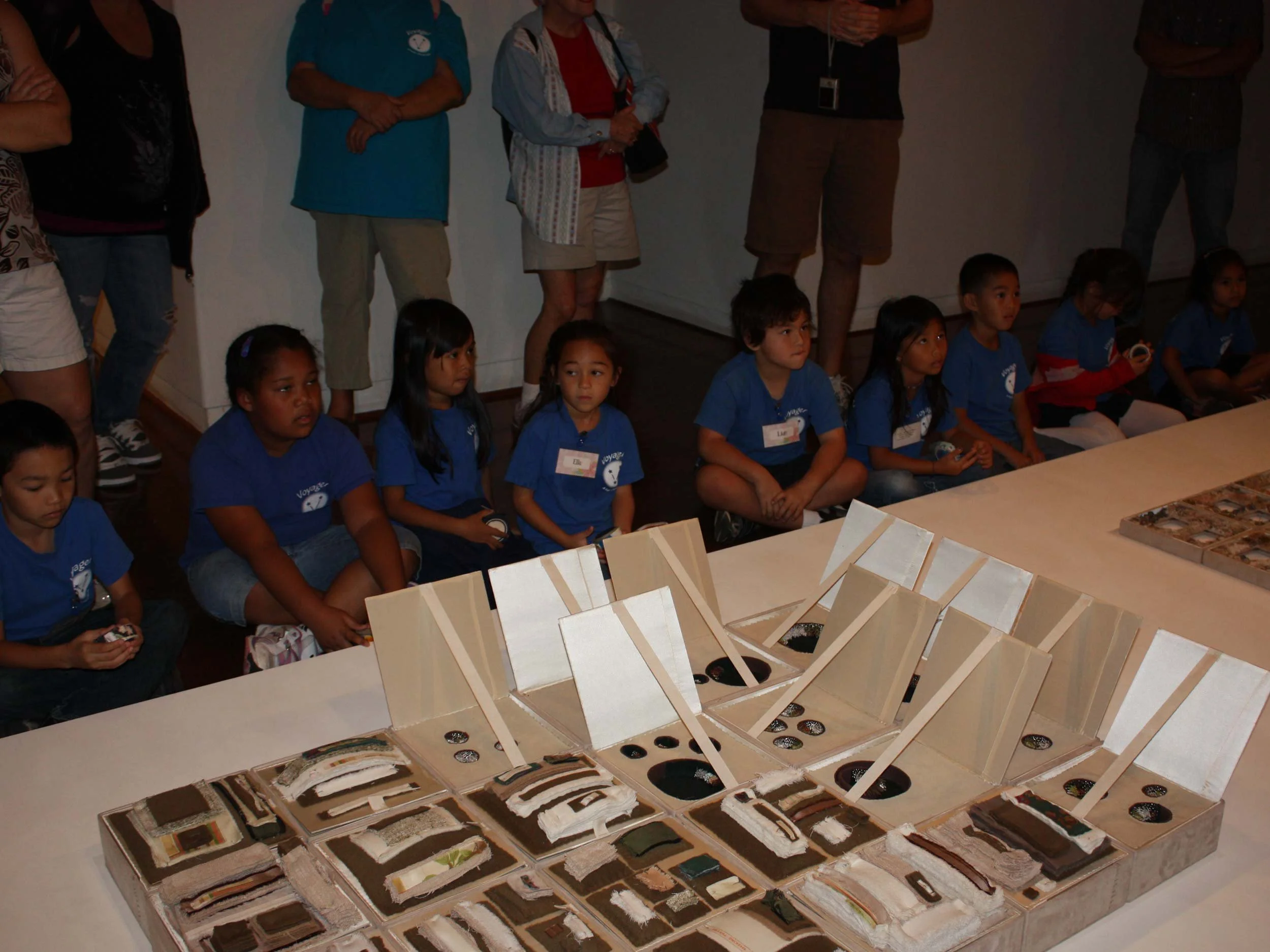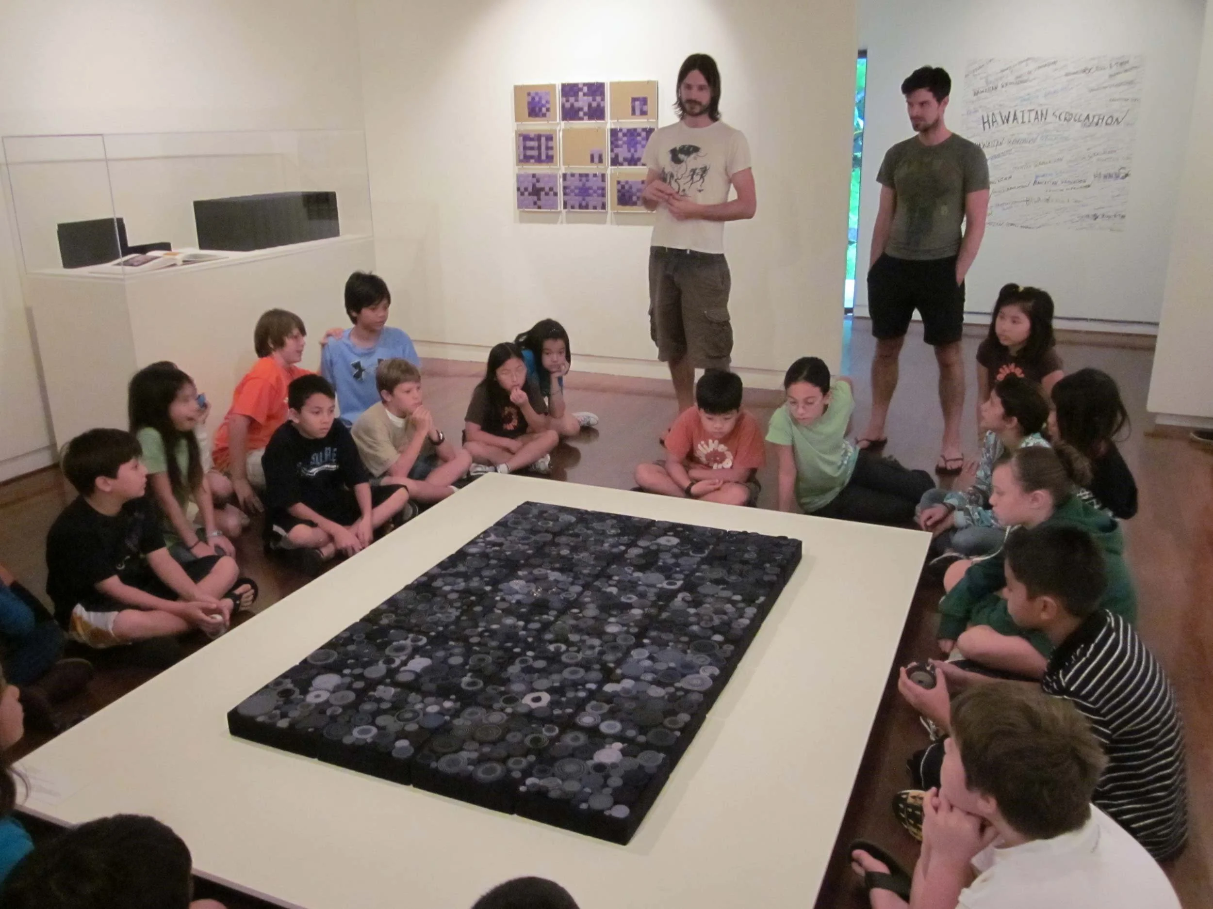 During their exhibition 9769 Radio Drive at The Contemporary Museum, Hawaii, Steven and William Ladd organized a Scrollathon with multiple Hawaiian student groups in January and February of 2011. Collaborating with their local communities, participants embarked on a mission of transforming textile waste into art objects, fostering a sense of environmental responsibility. The materials for this project were sourced from an old Brooklyn factory, Bromeliad plants from the museum grounds, and an“aloha print” fabric representing the students’ cultural background. Each participant first created a personal scroll to keep as a memento of their immersive experience. Then, working collaboratively, they created an installation of scrolls which was hung outside the museum entrance, showcasing the power of their combined voices to create a visual artwork that all visitors can enjoy. To commemorate their involvement, each participant’s photograph, along with an image of their individual scroll, was created to document their involvement. Following the Scrollathon, students were guided through the Ladd’s exhibition, gaining insight into Steven and William’s utilization of scrolls in their own artistic endeavors. Concluding the tour, students created their own scroll drawings for display in the Education Gallery.